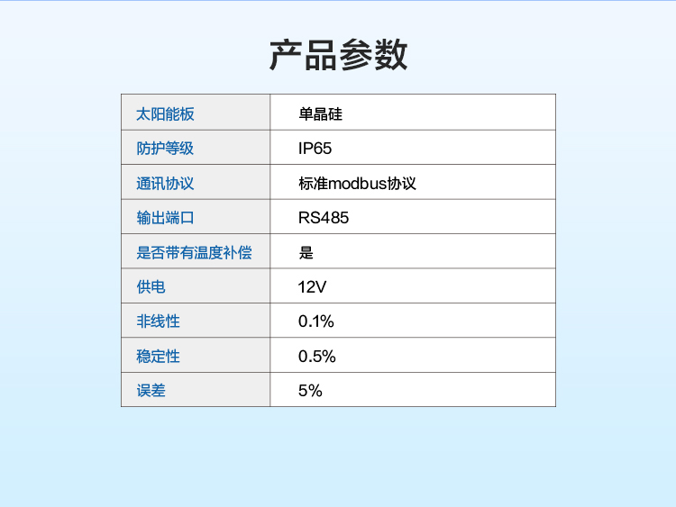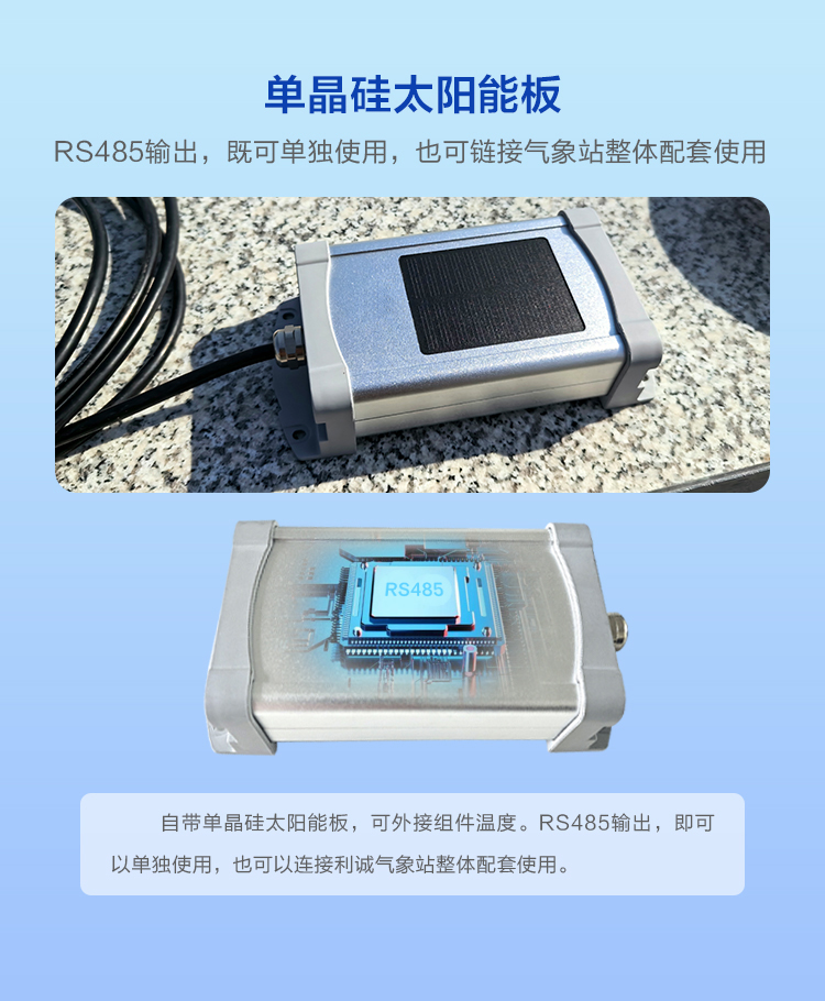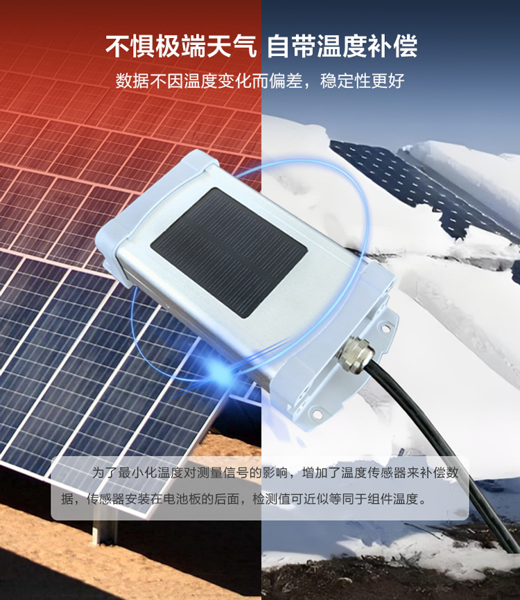 硅基輻照計是一款低成本、測量數據準確的輻照度傳感器,可用于評估光伏發電系統效率。其傳感器的本身,采用硅基結構與光伏組件的結構相似,特別是它的光譜響應以及傾斜誤差都與光伏組件極其相似,這讓使用硅基傳感器來精準的分析光伏組件輻照度數據有據可循。