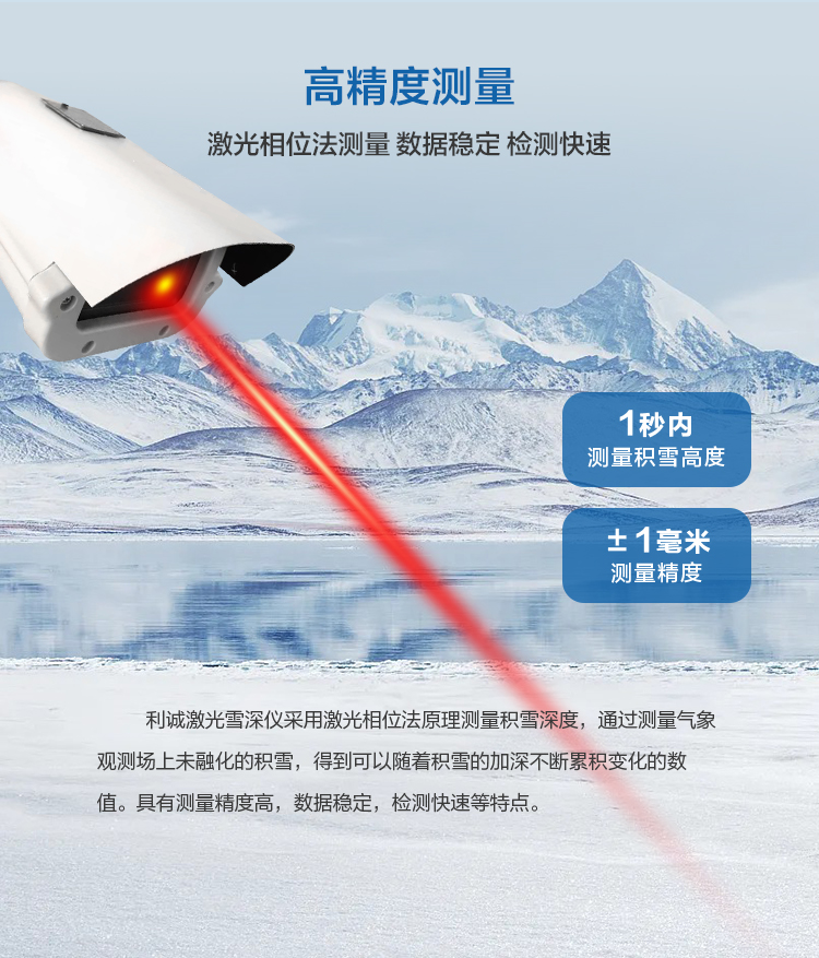 激光雪深儀采用激光相位法原理測量積雪深度,通過測量氣象觀測場上未融化的積雪,得到可以隨著積雪的加深不斷累積變化的數值。具有測量精度高,數據穩定,檢測快速等特點。