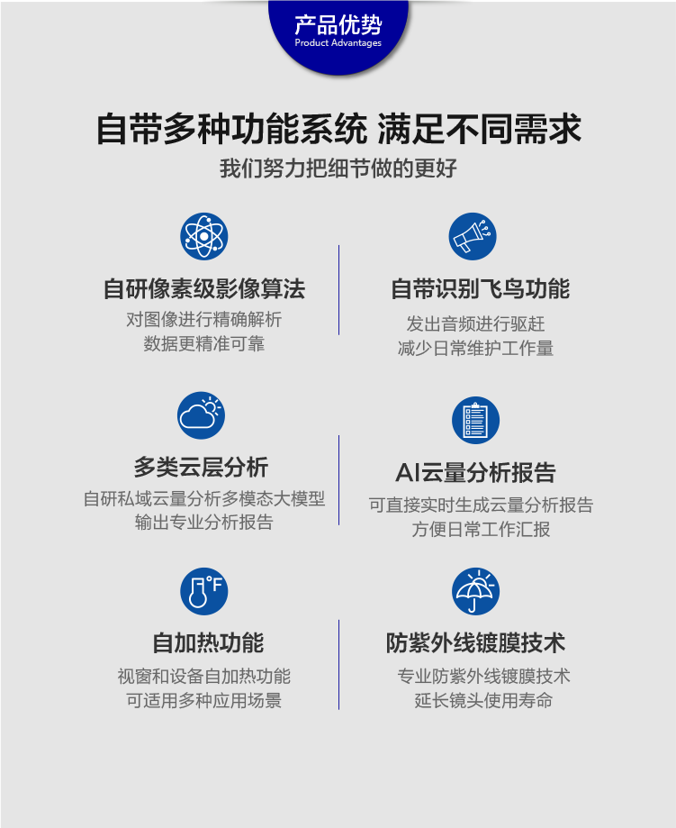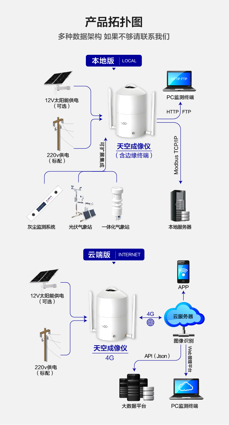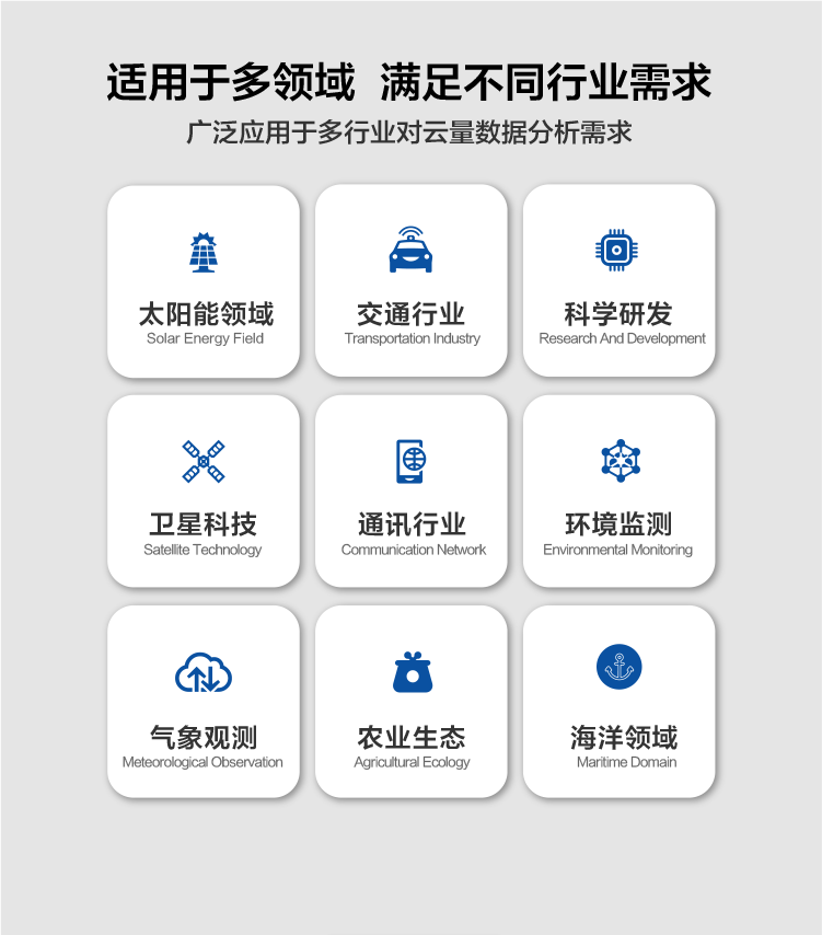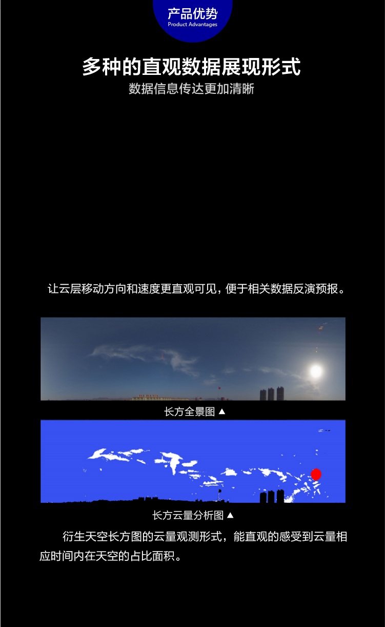 DC-TK系列全天空成像儀是一種用于監(jiān)測天空云量的儀器設(shè)備。它是由一系列的光學(xué)鏡頭、濾光片、光電傳感器以及視覺處理設(shè)備組成。全天空成像儀可以在無太陽遮擋而完全暴露在太陽光照之下清晰捕捉天空的圖像,并通過深度學(xué)習(xí)技術(shù)的云視覺算法分析天空圖像中的云量、云狀、云軌跡等參數(shù),可以用于,應(yīng)用領(lǐng)域氣象觀測、環(huán)境監(jiān)測、氣候研究、天氣預(yù)報、太陽能評估及監(jiān)測、光功率預(yù)測、電站設(shè)計、農(nóng)林生態(tài)建筑設(shè)計及衛(wèi)星驗證等領(lǐng)域。